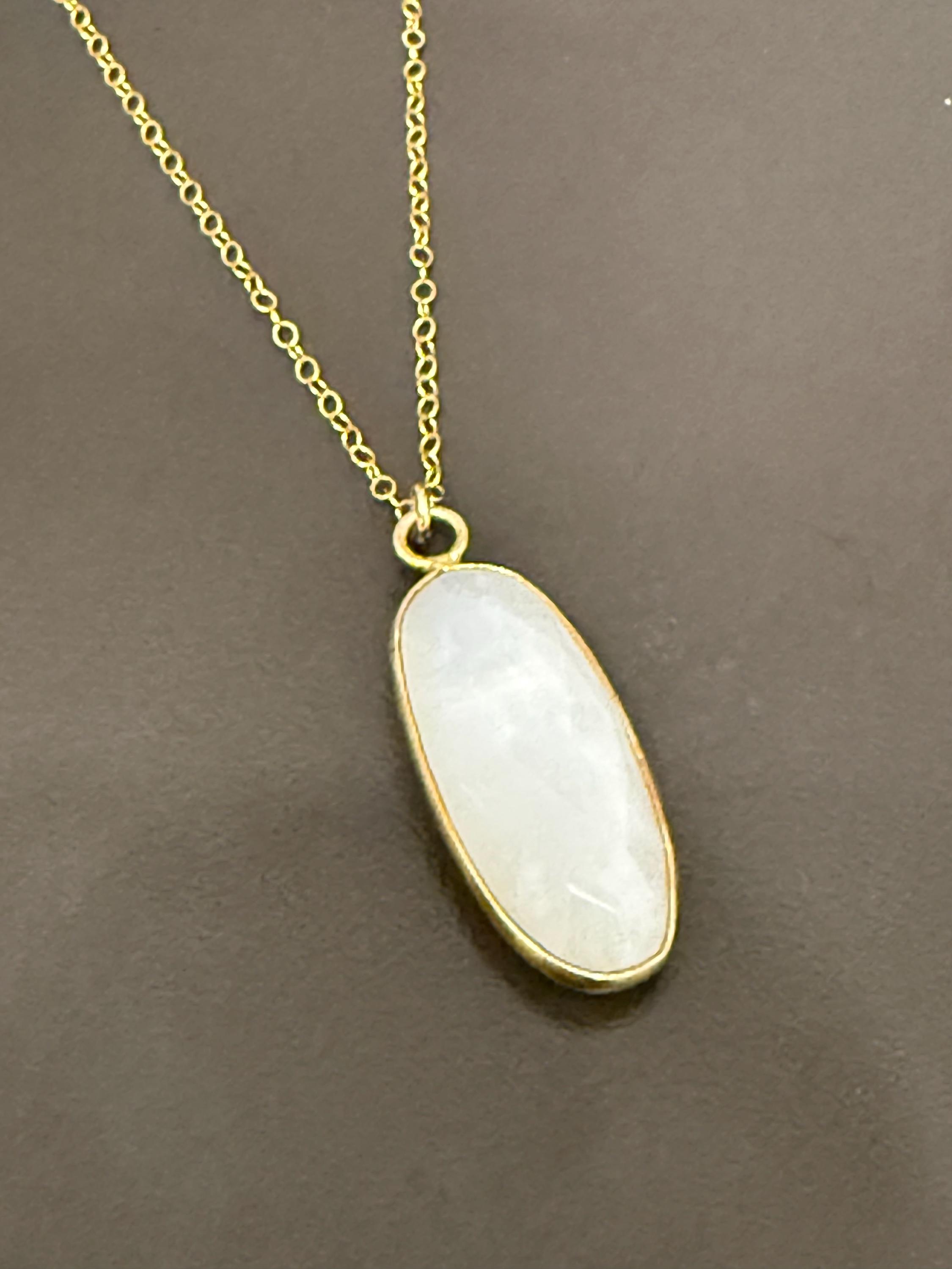 This gorgeous necklace features a stunning faceted moonstone oval bezel set in 22k gold over silver. I love this piece for how neutral it is - it will match any outfit - and the delicate statement it makes. The iridescent moonstone catches the light and flashes gorgeous colors.