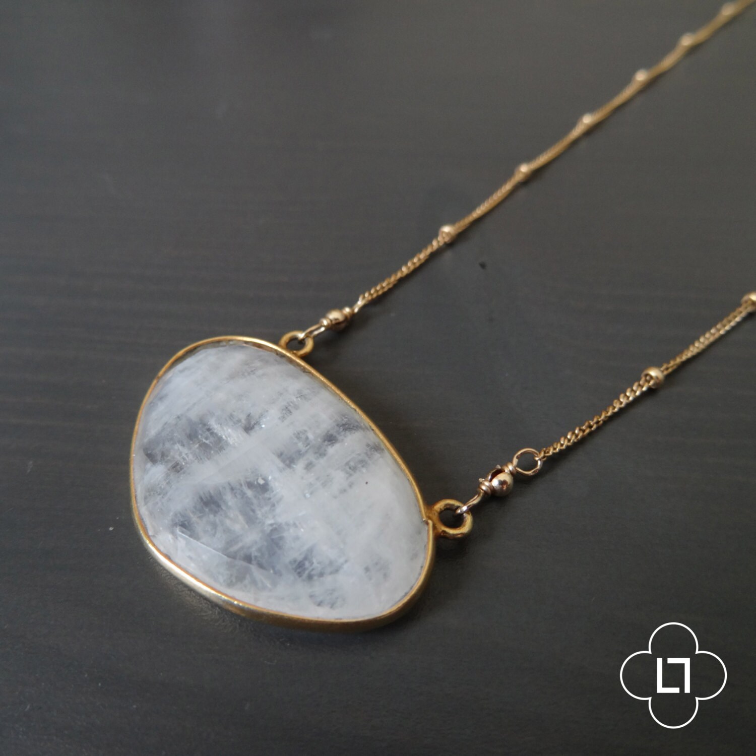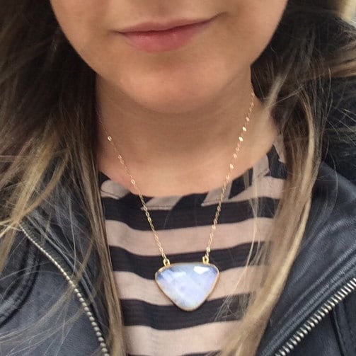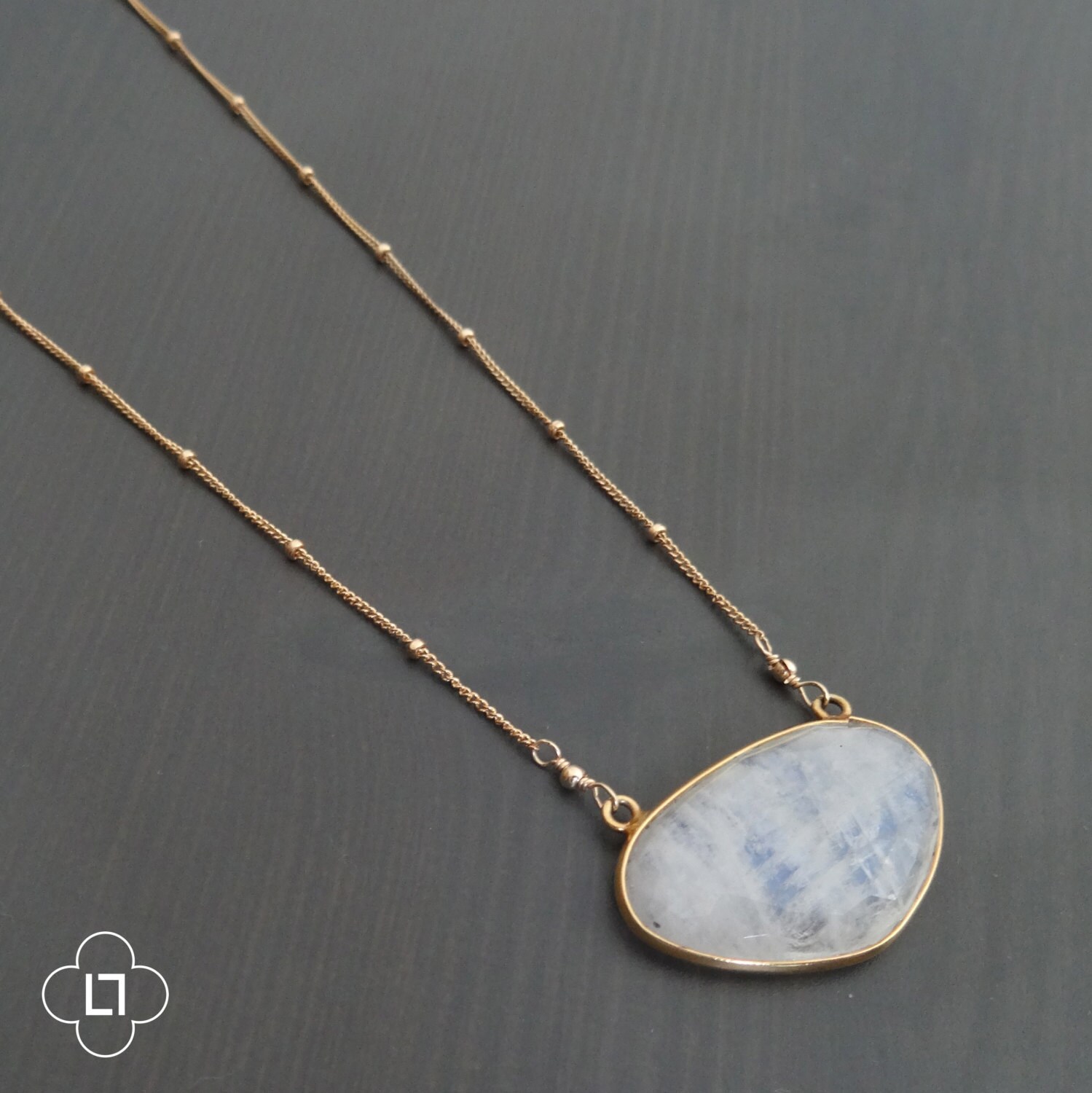 This necklace features a gorgeous piece of moonstone which is bezel set in 14k gold over silver. It is suspended from a 14k gold-filled satellite chain, but I can do it from a traditional cable chain too. This necklace looks fabulous alone, but is beautiful layered with another minimal gold necklace. Check out some options below:
