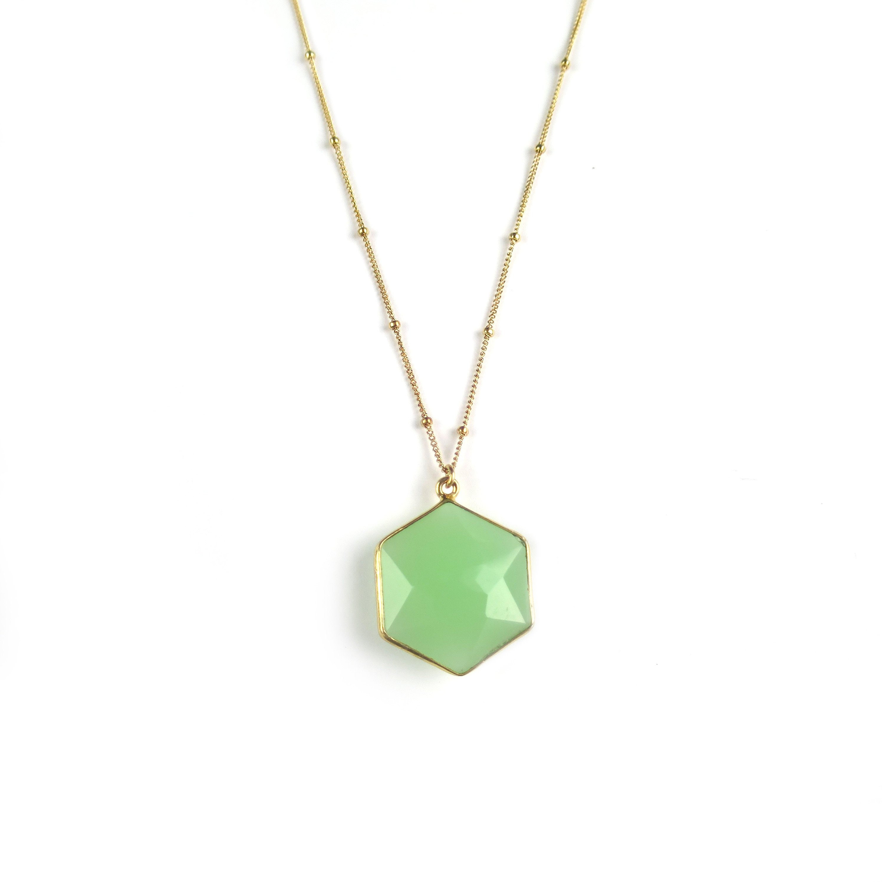 Hexagons are the perfect accent to any outfit! I can't get enough of this shape and love how its edgy angles are a great contrast with the raw beauty of these gemstones. I hung this pendant from a delicate little gold filled satellite chain that will retain its color for years. These are all about the size of a quarter. My favorite part of this color: it really pops on a tan, but also looks fabulous with a red sweater for the holidays!
