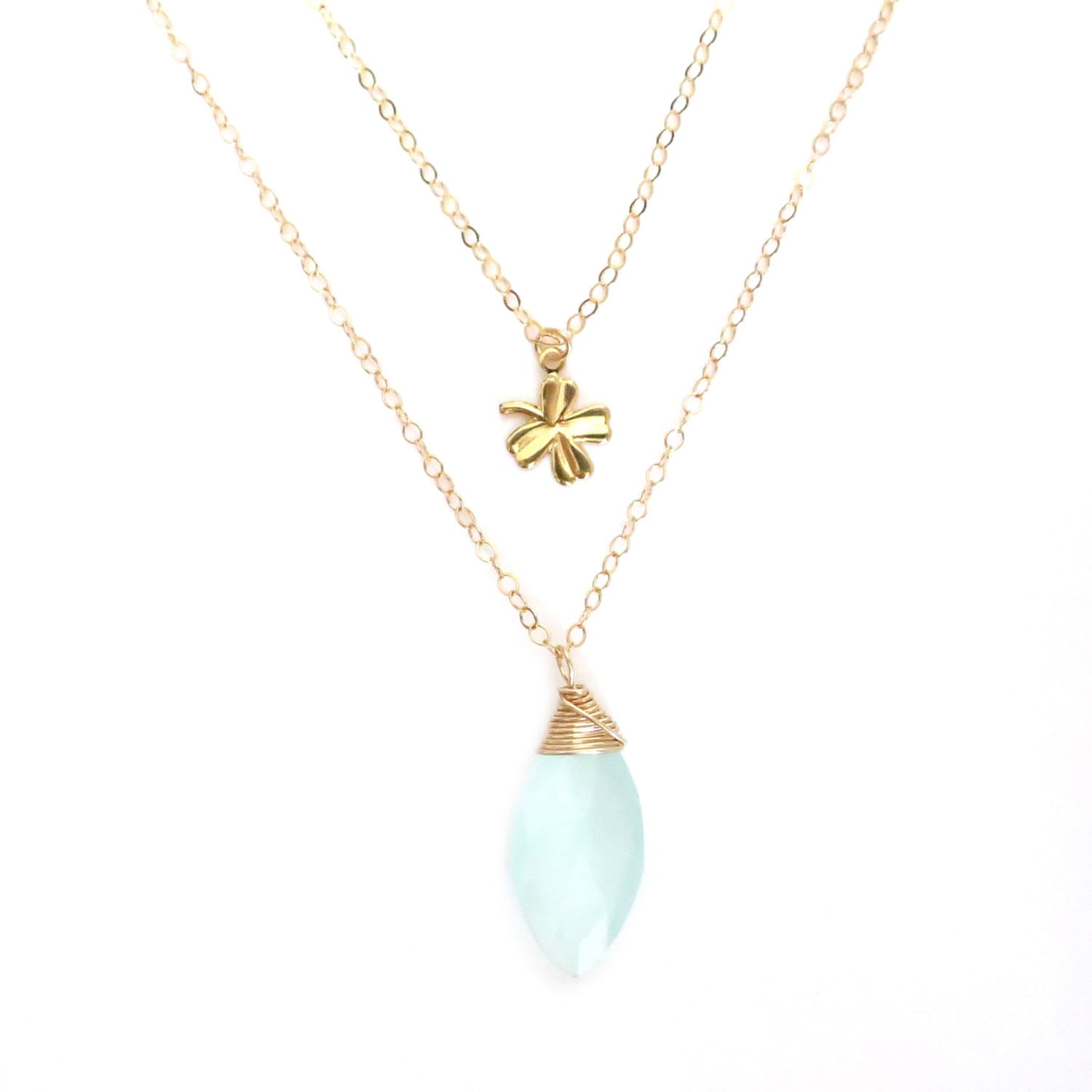 This uniquely shaped beautiful aqua chalcedony is hand-wrapped in gold filled wire and paired with a lucky little gold-filled four leaf clover. Sparkly and beautiful!