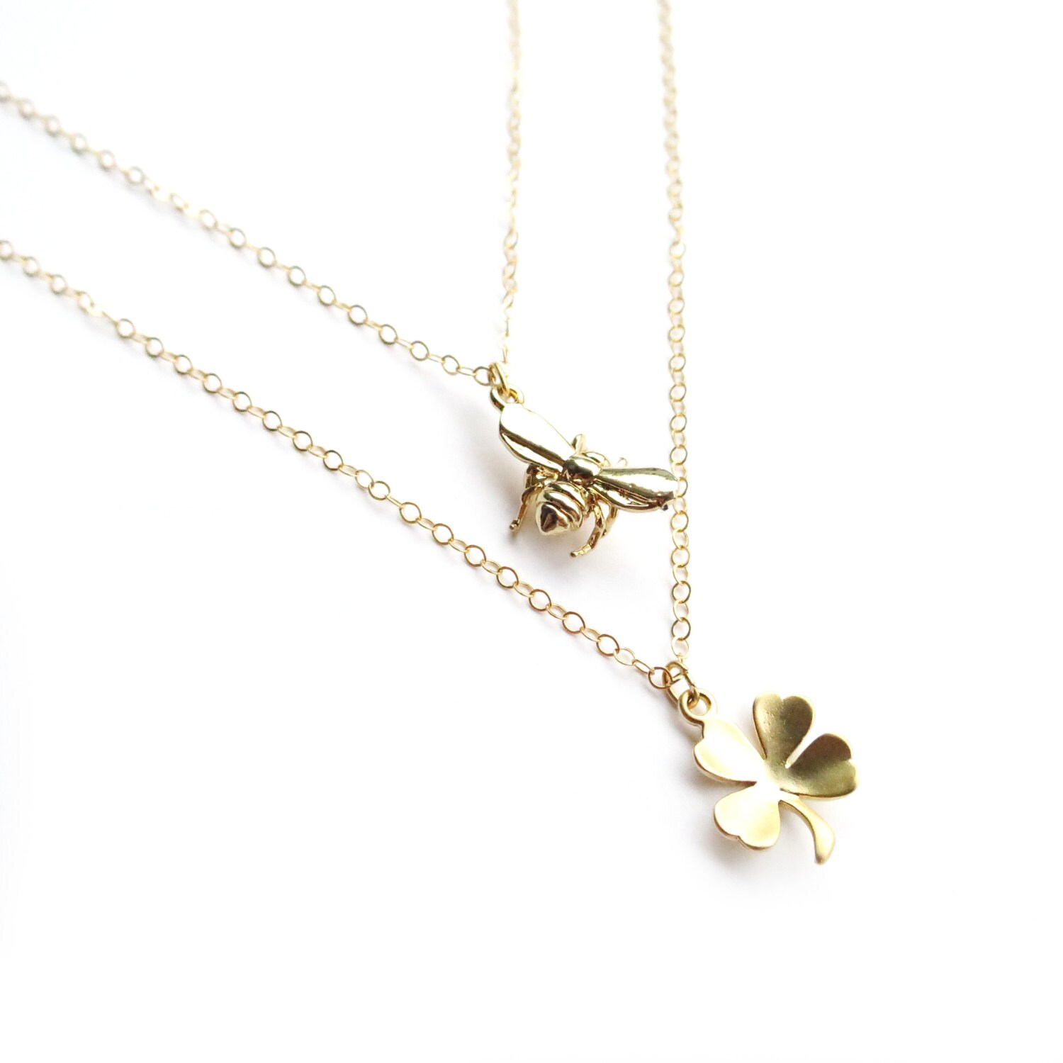 This gold good luck charm necklace set is sweet as honey with its gold bee and small four leaf clover!