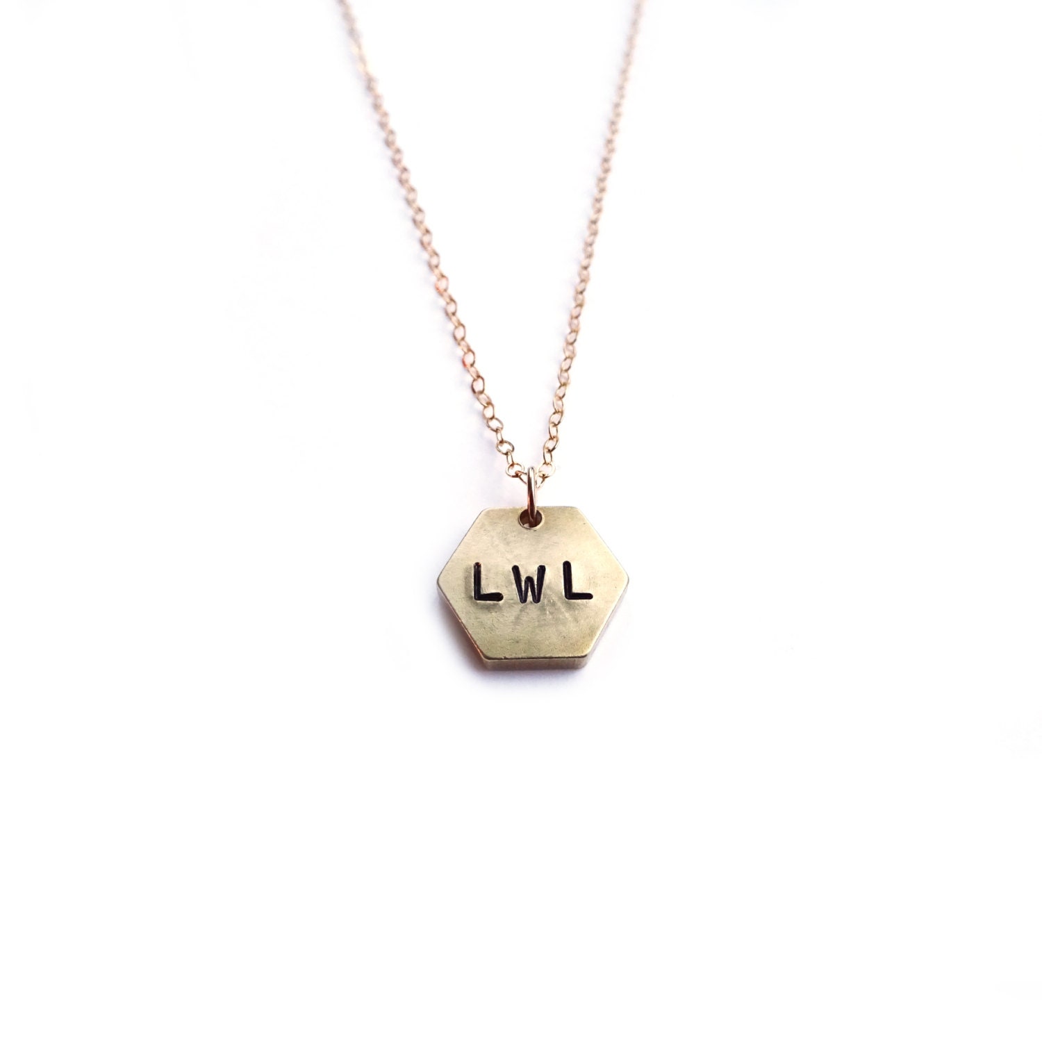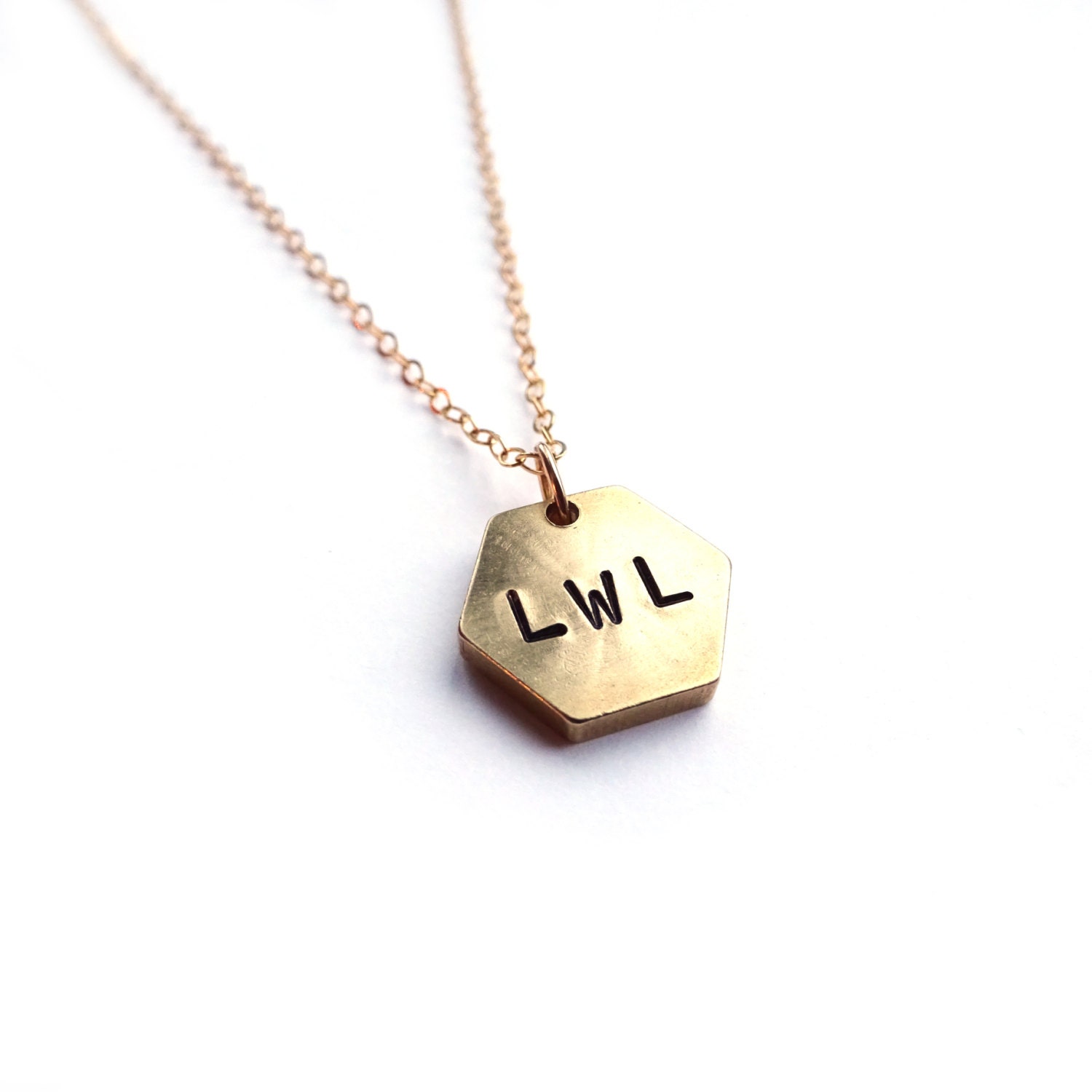 This dainty hexagon gold hand stamped pendant necklace can be personalized or left blank! It makes a wonderful gift for a minimalist enthusiast - truly one of a kind!
