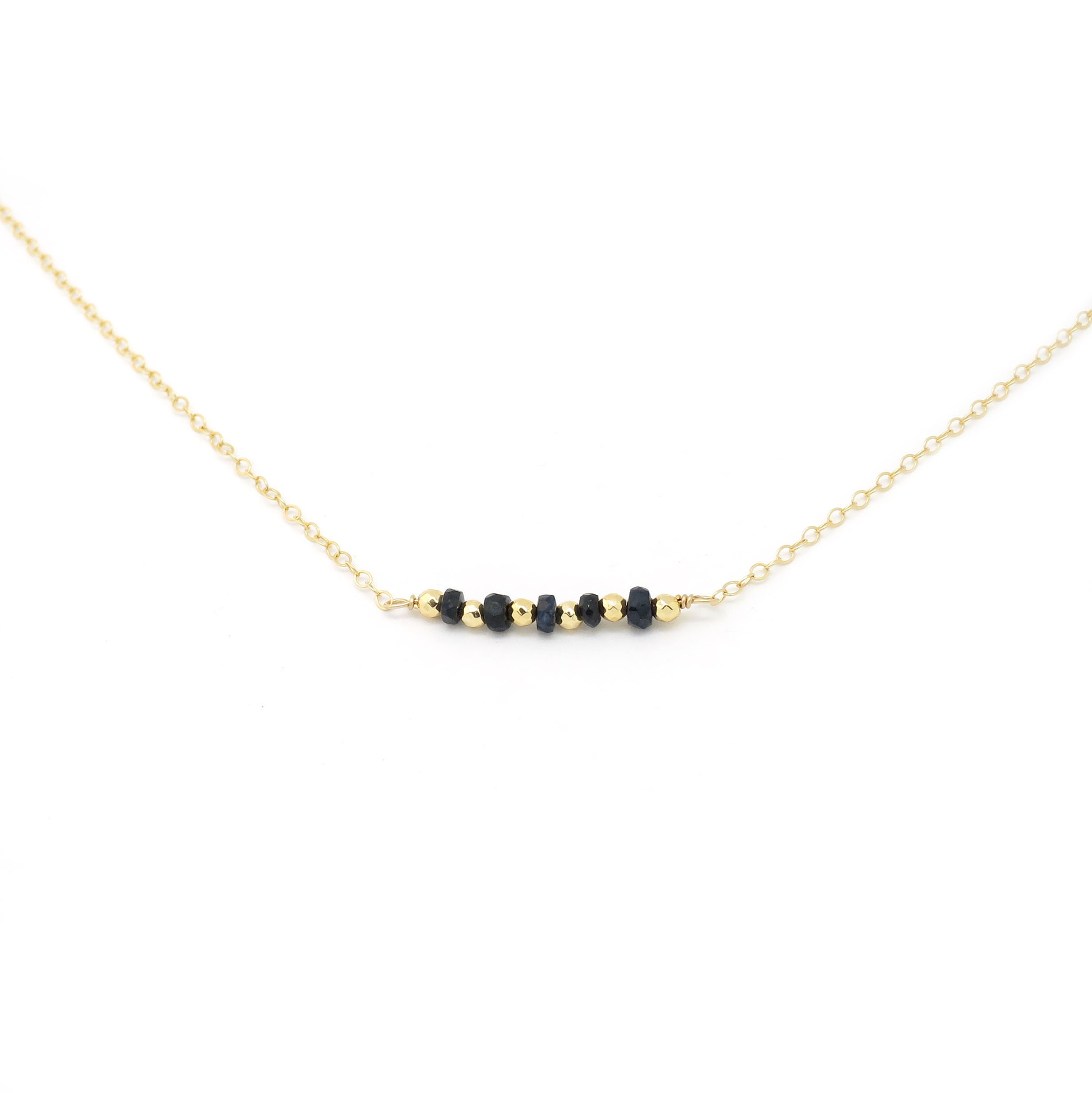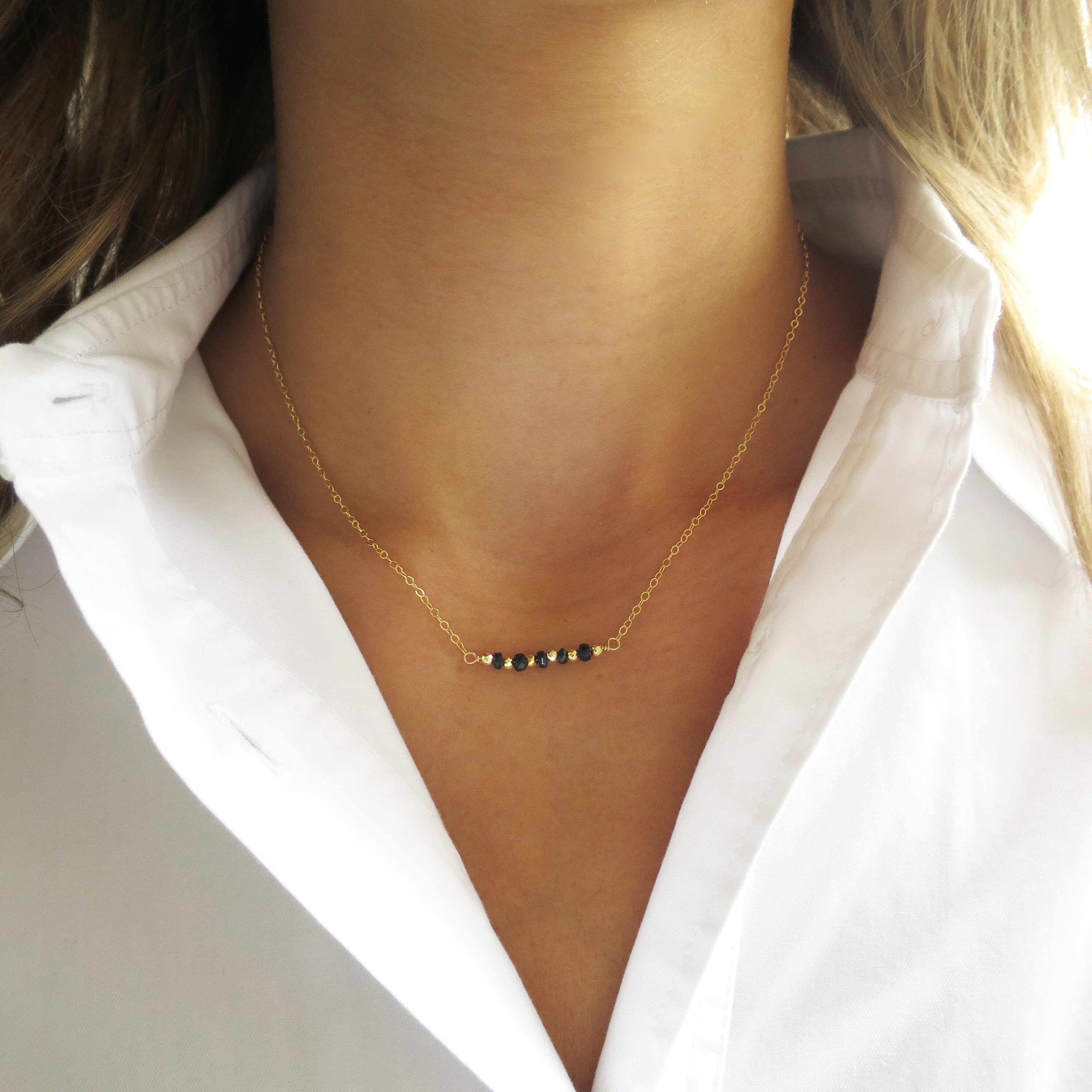 This dainty necklace features a bar of little faceted, genuine sapphire beads on 14k gold filled chain (or silver). It's a beautiful top layer, but also looks perfect by itself! A perfect birthday gift featuring the September birthstone!